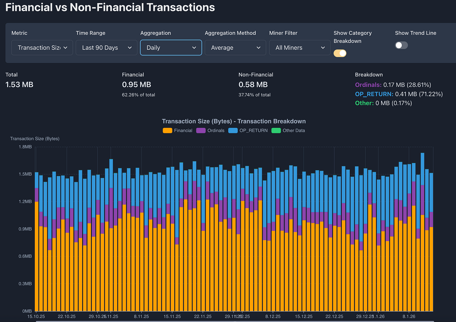 While I strive for accuracy, blockchain analytics involves classification decisions that may differ from other methodologies. Aggregate statistics are derived from my own data processing pipeline and have not been independently audited. Individual large OP_RETURN transactions can be verified on public block explorers. I welcome corrections from any party who believes data presented here is inaccurate.
